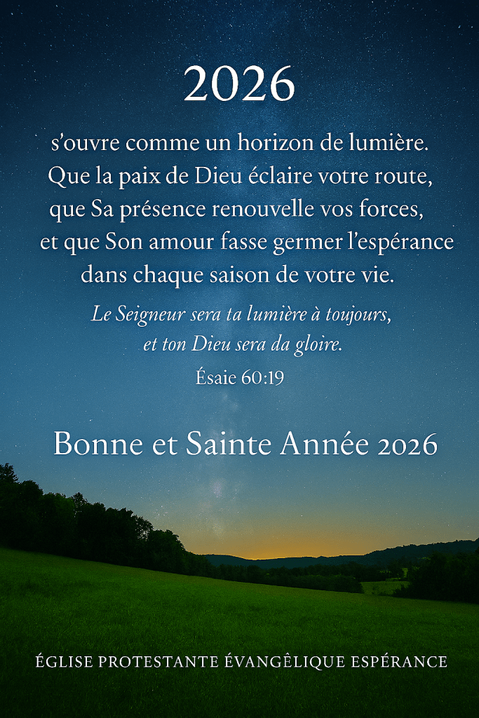 - Dimanche 04 janvier 2026 , culte de 10h30 à 12h dans les locaux de l’église Jeanne d’Arc de Montpellier au 55 rue des Colombes à Montpellier de 10h30 à 12h . Le culte sera suivi d’un apéritif.